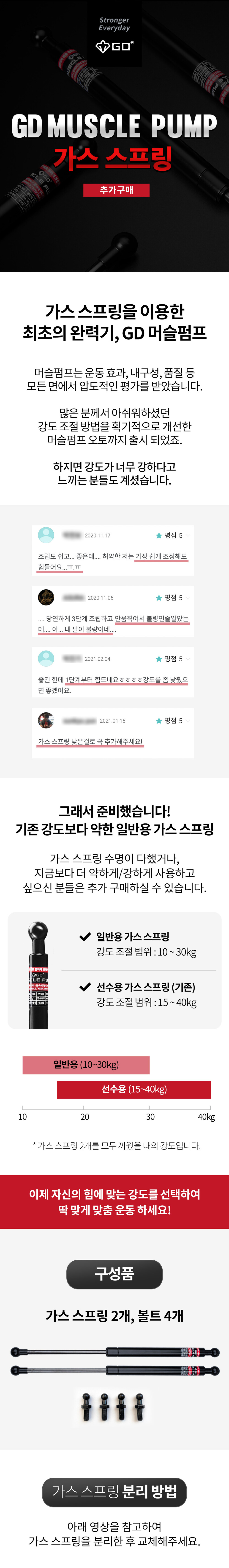 갖고 계신 머슬펌프의 강도가 너무 강했다면 일반용 가스스프링을, 부단한 노력으로 상체 근력이 향상되었다면 선수용 가스스프링을 추가구매해서 사용해보세요!