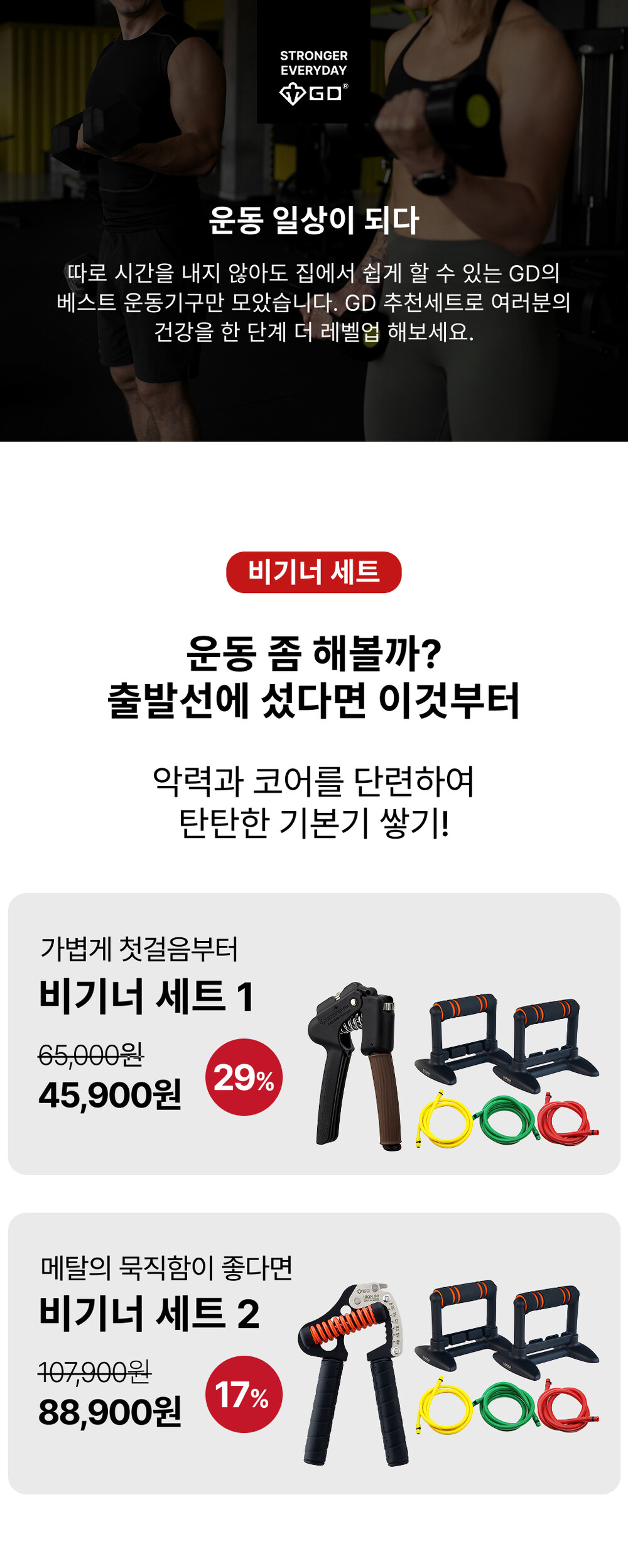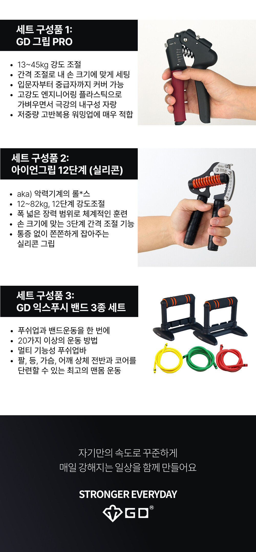 악력은 모든 운동의 기본! 무엇을 쥐고, 잡고, 들고, 당기고 미는 힘은 '손 힘'에서 출발합니다. 일상생활을 넘어 헬스, 배드민턴, 골프, 테니스, 클라이밍, 사이클링, 요가 등 모든 운동의 기본이 악력이라고 해도 과언이 아니죠. 악력과 코어를 단련하여 어떤 운동을 하던지 탄탄한 기본기를 다질 수 있게 도와드리는 필수 세트를 소개합니다.