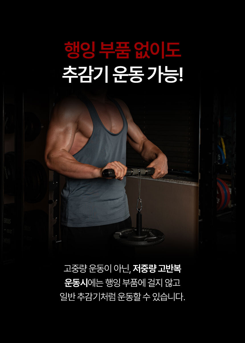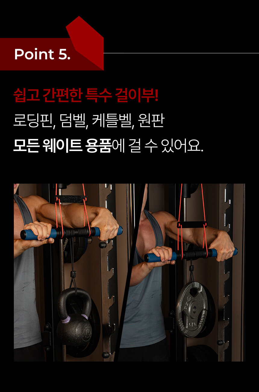 행잉 걸이부가 업그레이드되어 더욱 강력한 전완근 운동이 가능합니다. 단품으로 사용하셔도 좋고, 행잉 부품과 함께 사용하셔도 좋습니다.