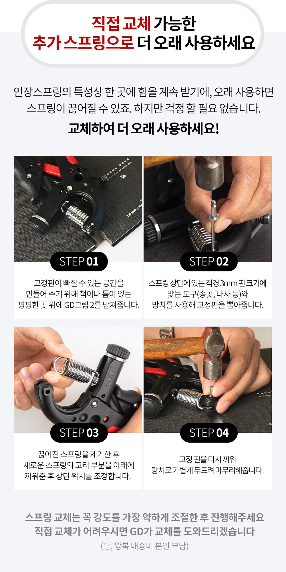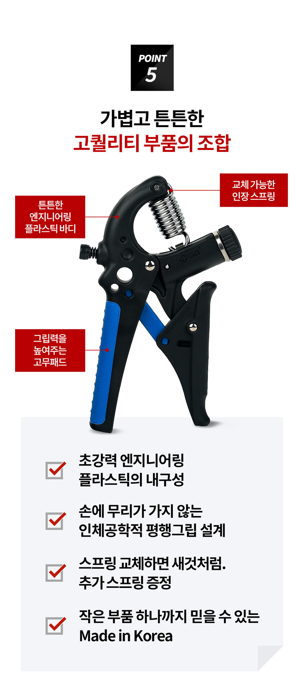 평행그립의 몸체는 고강도 엔지니어링 플리스틱 소재로 일반 플라스틱과는 차원이 다른 내구성을 자랑합니다. 가볍고 튼튼한 몸체에, 스프링만 갈아 끼우면 오랫동안 새 제품처럼 사용할 수 있습니다.