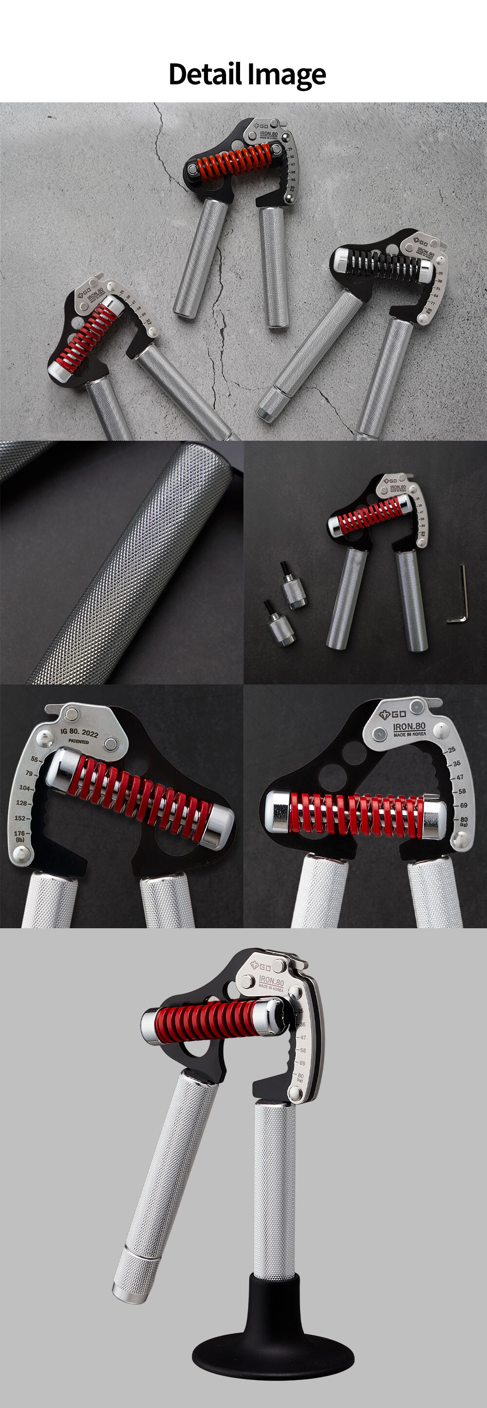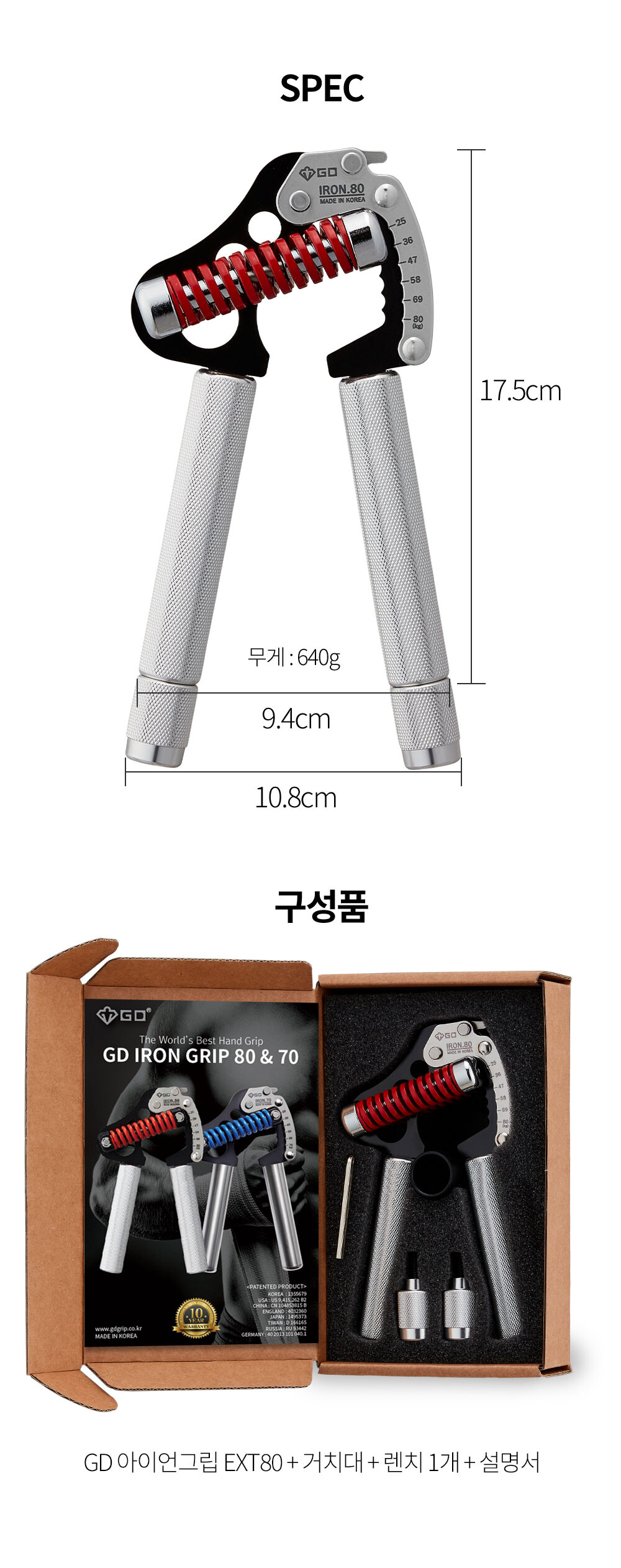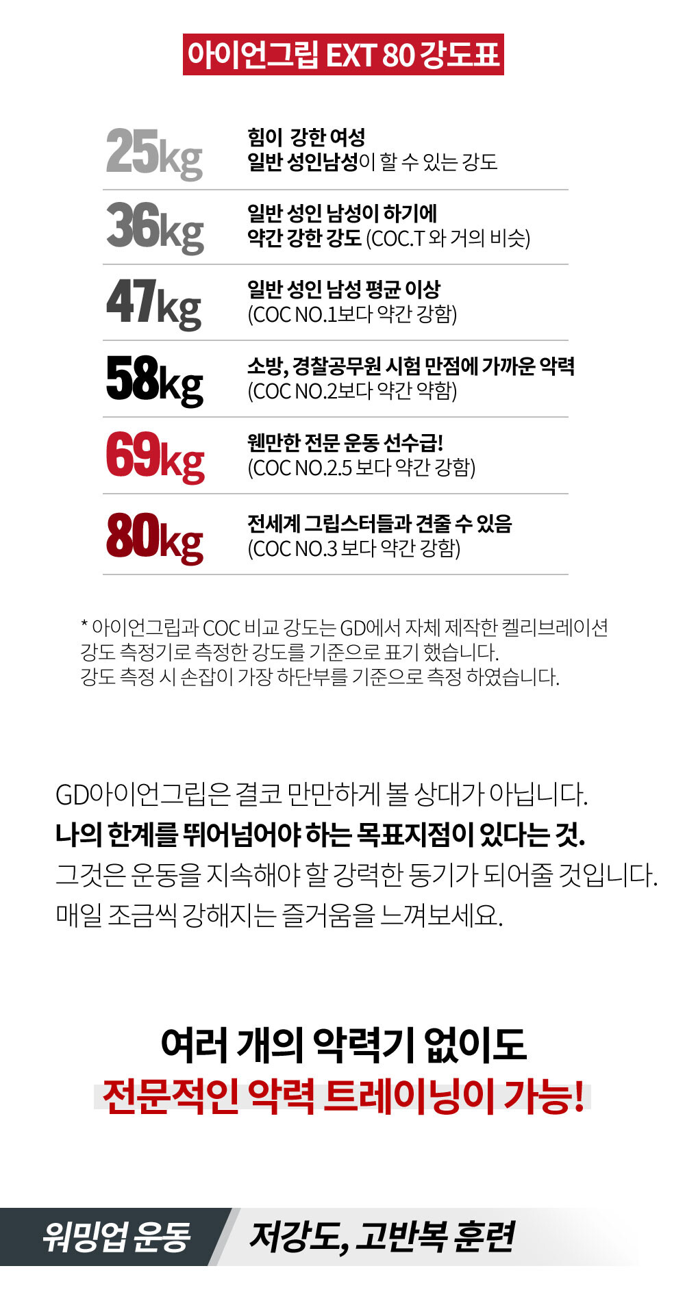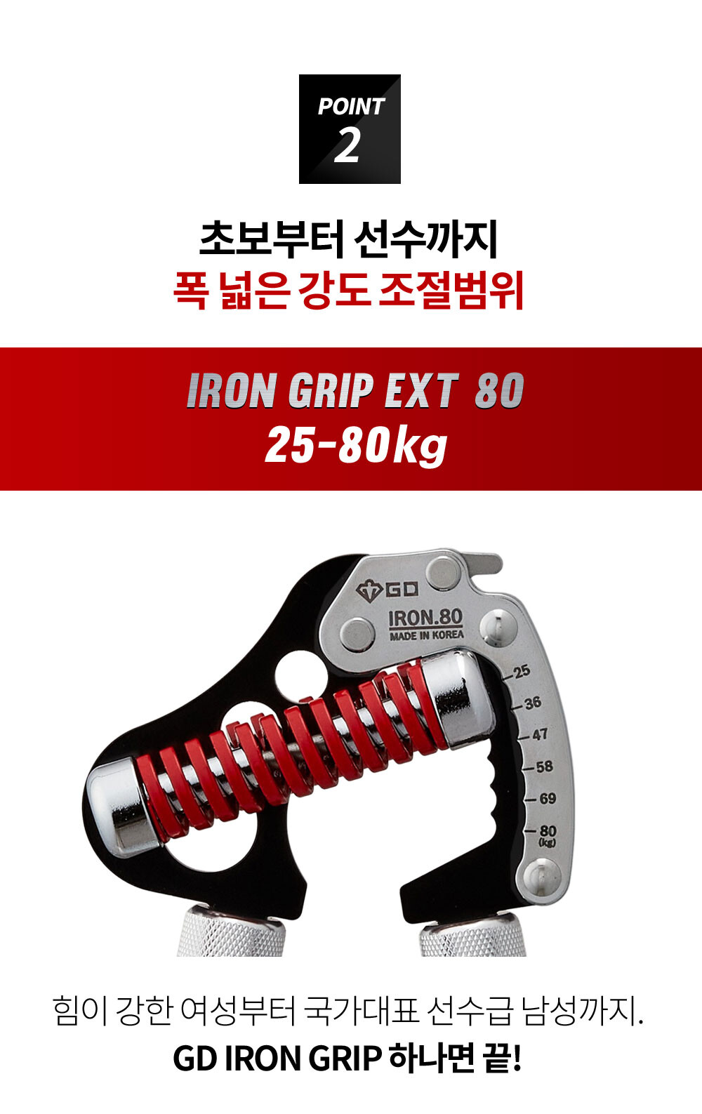 GD IRON GRIP EXT 80은 25~80kg까지 조절되는 고장력 범위 악력기 입니다. 일반 남성부터 프로 선수까지 자신의 악력에 맞추어 운동 하실 수 있습니다.