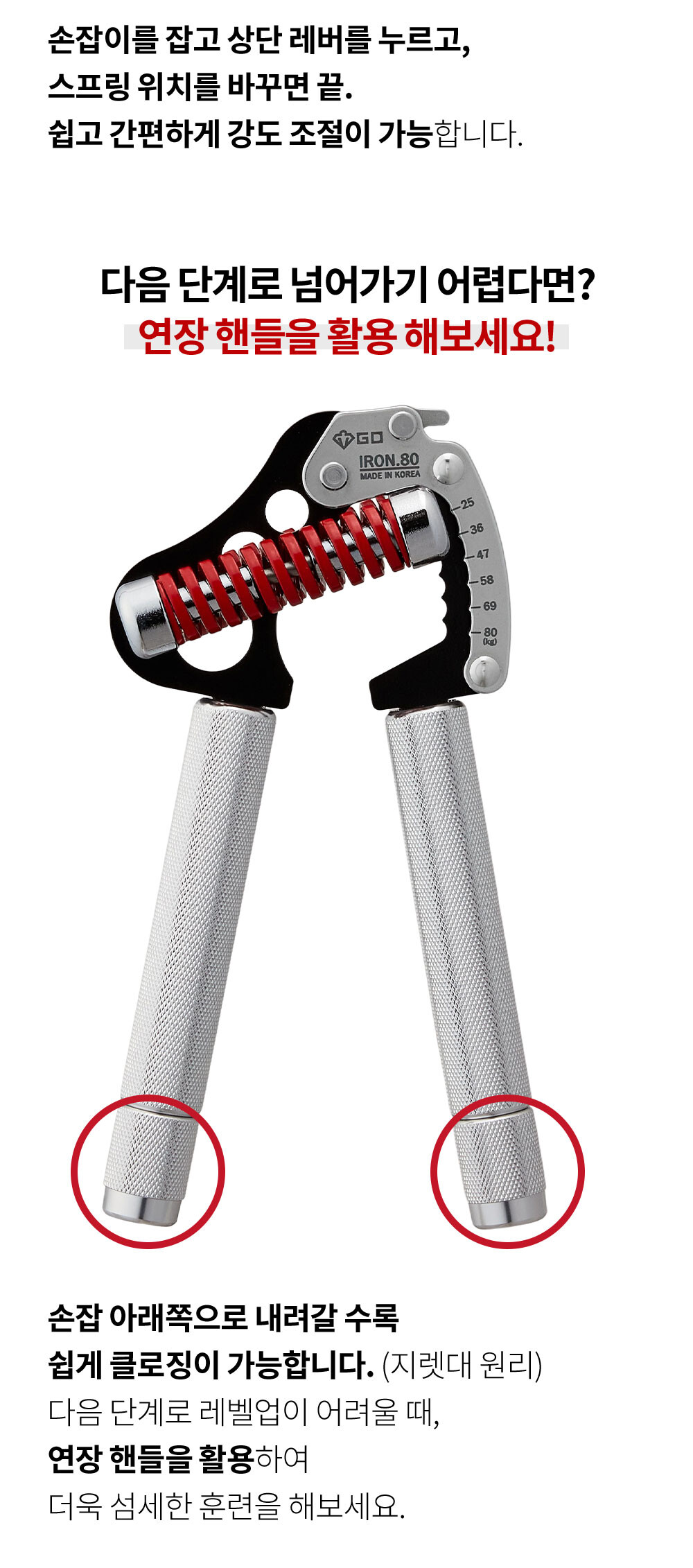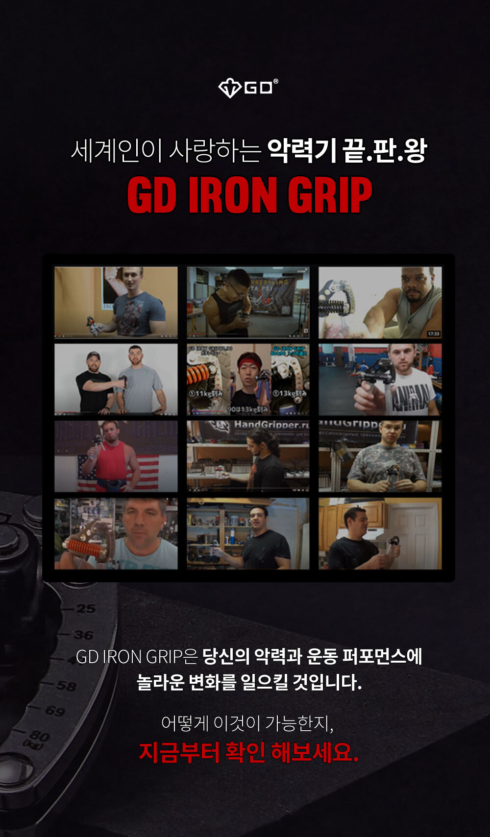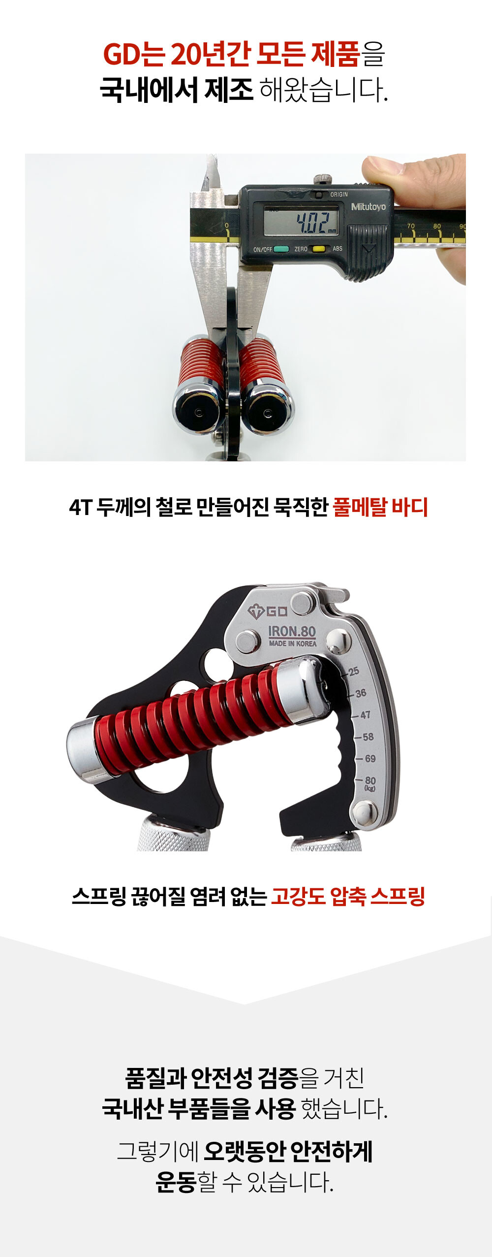 GD IRON GRIP EXT 80은 25~80kg까지 조절되는 고장력 범위 악력기 입니다. 일반 남성부터 프로 선수까지 자신의 악력에 맞추어 운동 하실 수 있습니다.