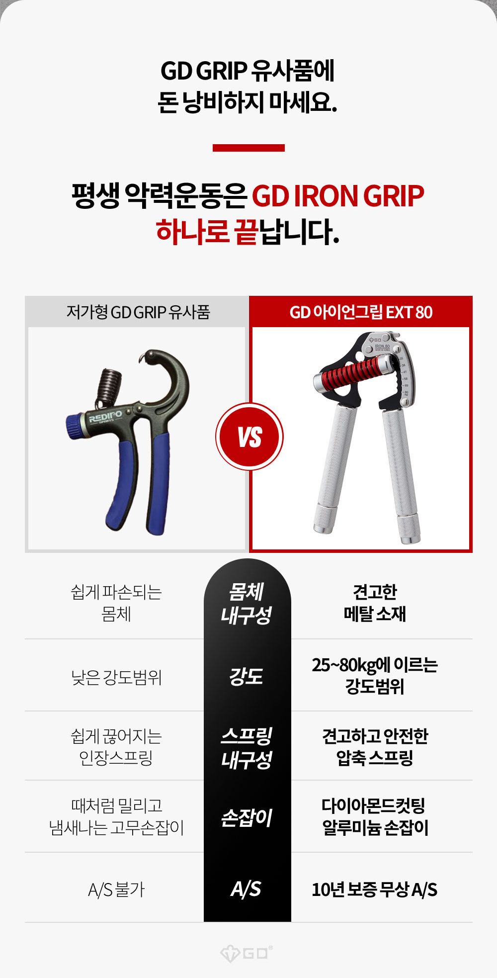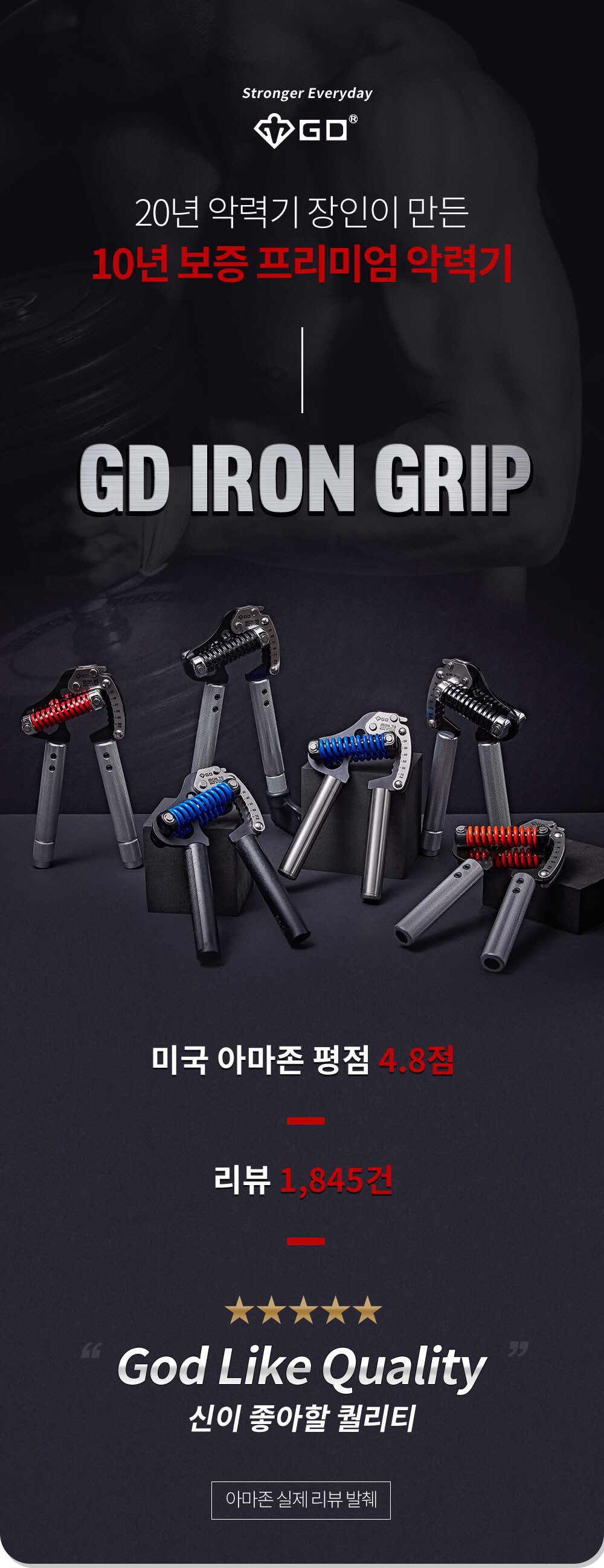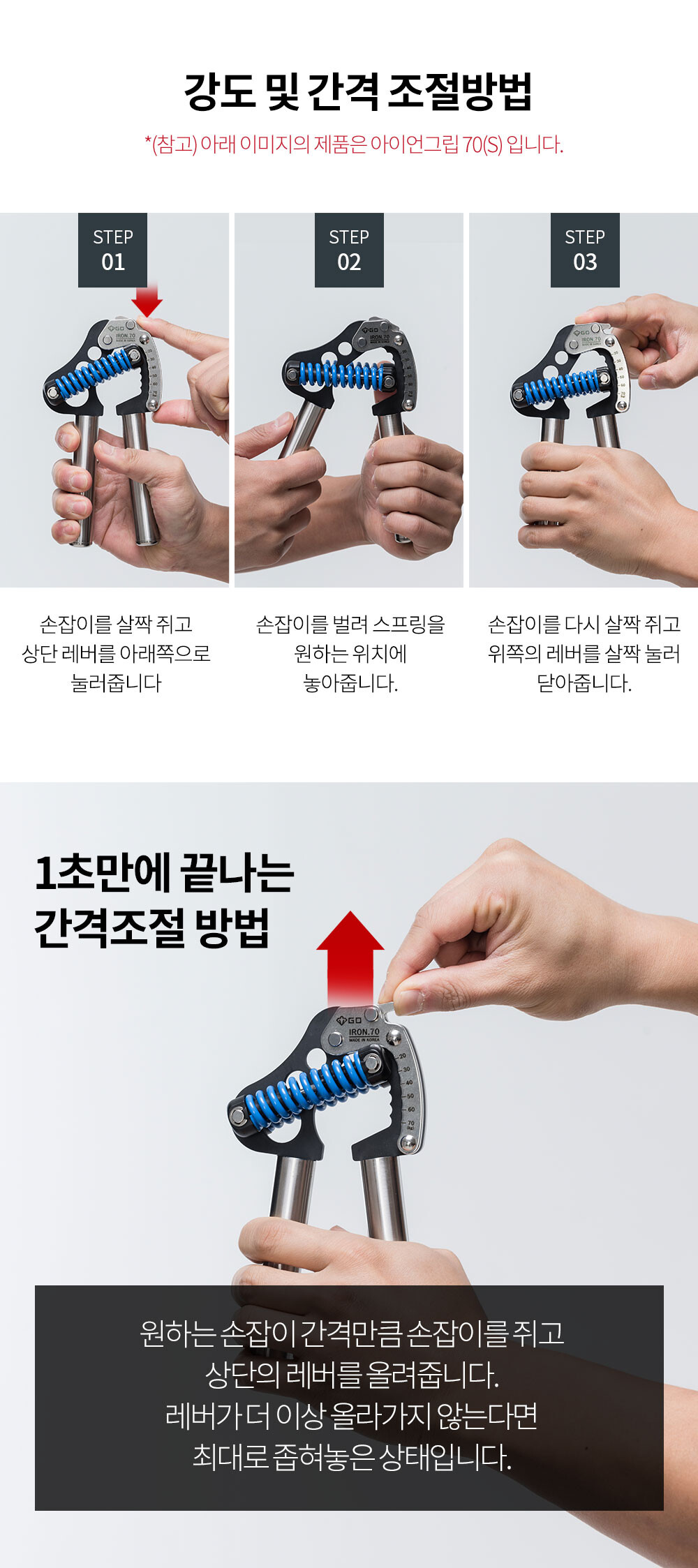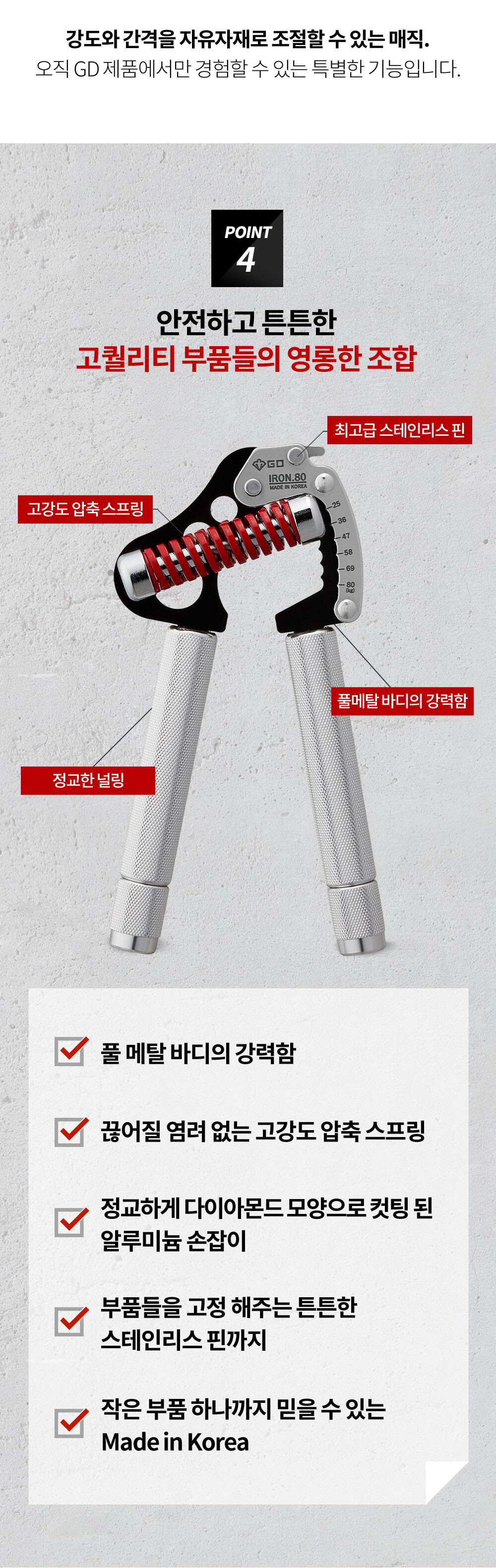 GD IRON GRIP EXT 80은 25~80kg까지 조절되는 고장력 범위 악력기 입니다. 일반 남성부터 프로 선수까지 자신의 악력에 맞추어 운동 하실 수 있습니다.