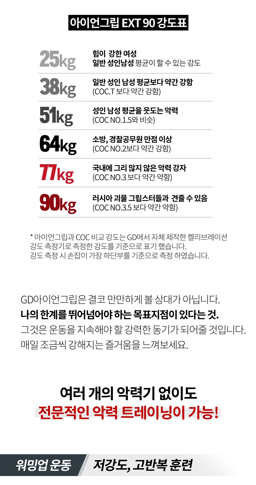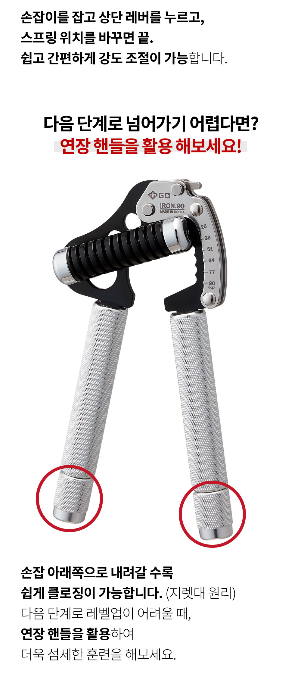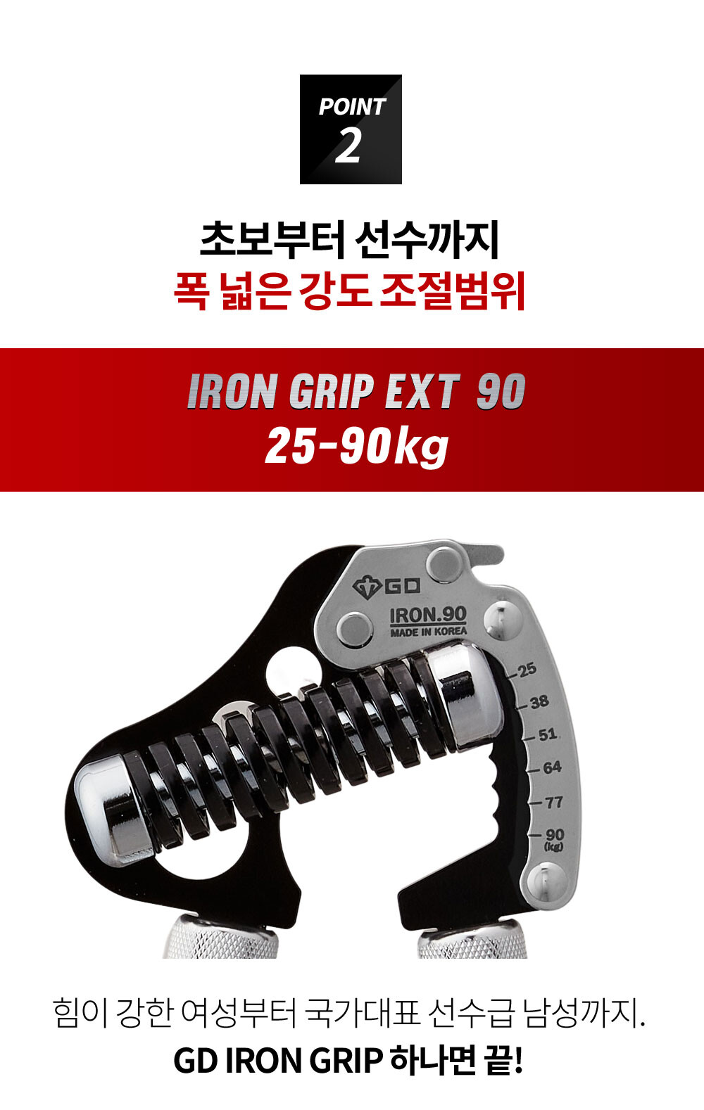 GD IRON GRIP EXT P 90은 25~90kg까지 조절되는 고장력 범위 악력기 입니다. 일반 남성부터 프로 선수까지 자신의 악력에 맞추어 운동 하실 수 있습니다.