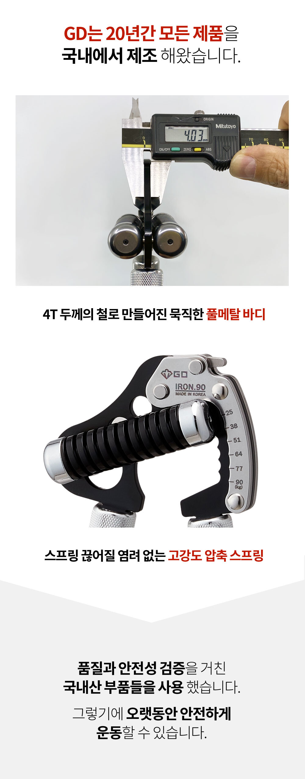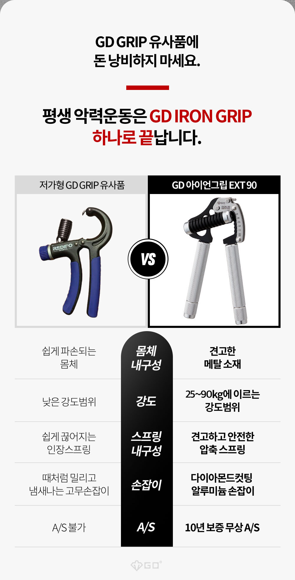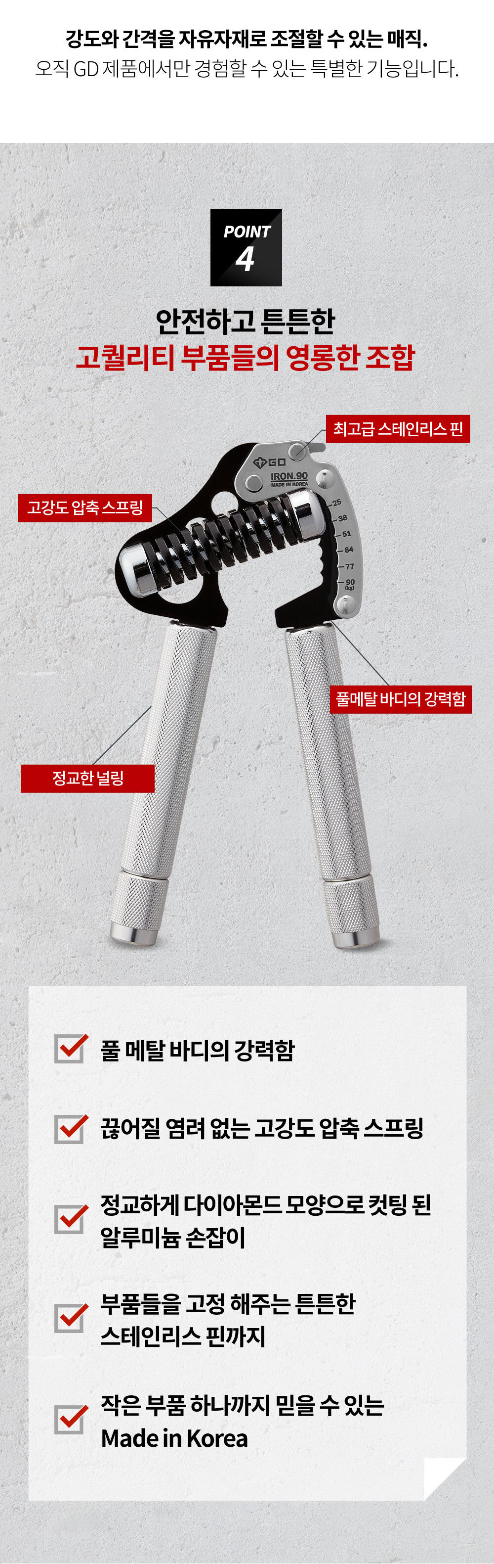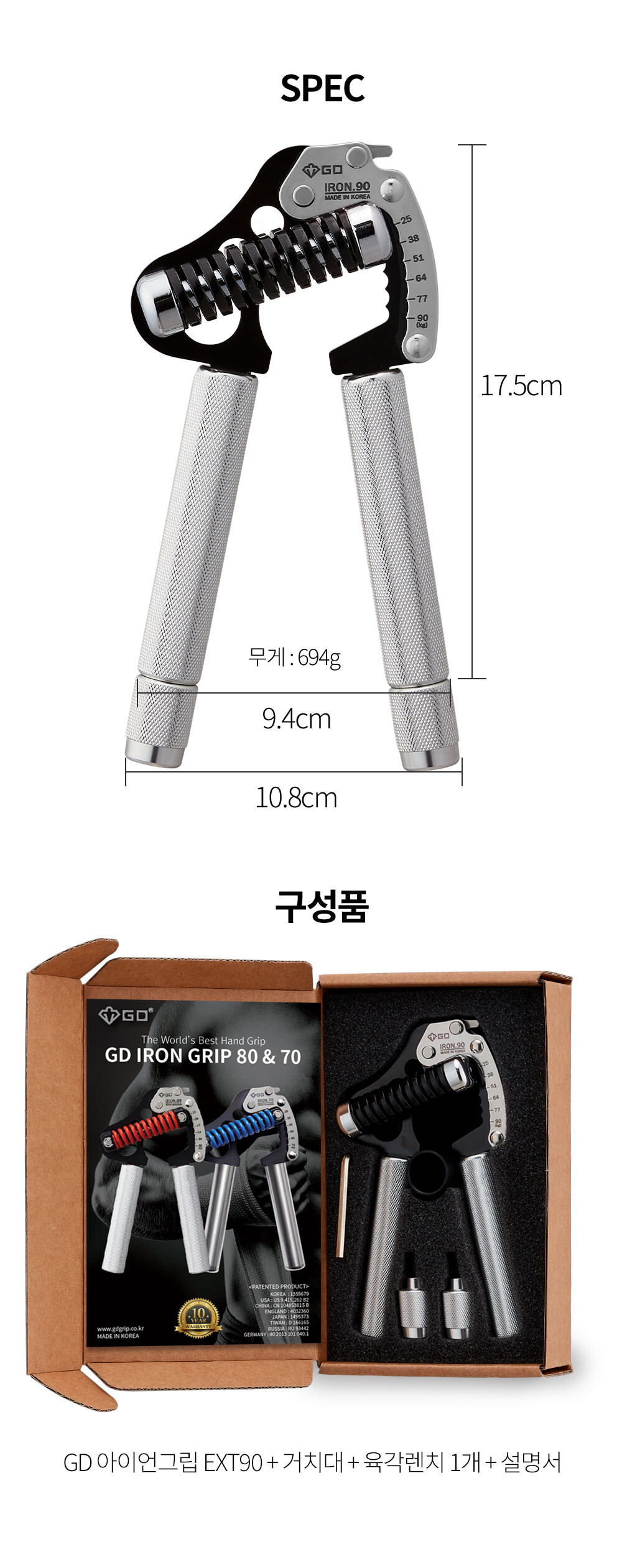GD IRON GRIP EXT P 90은 25~90kg까지 조절되는 고장력 범위 악력기 입니다. 일반 남성부터 프로 선수까지 자신의 악력에 맞추어 운동 하실 수 있습니다.
