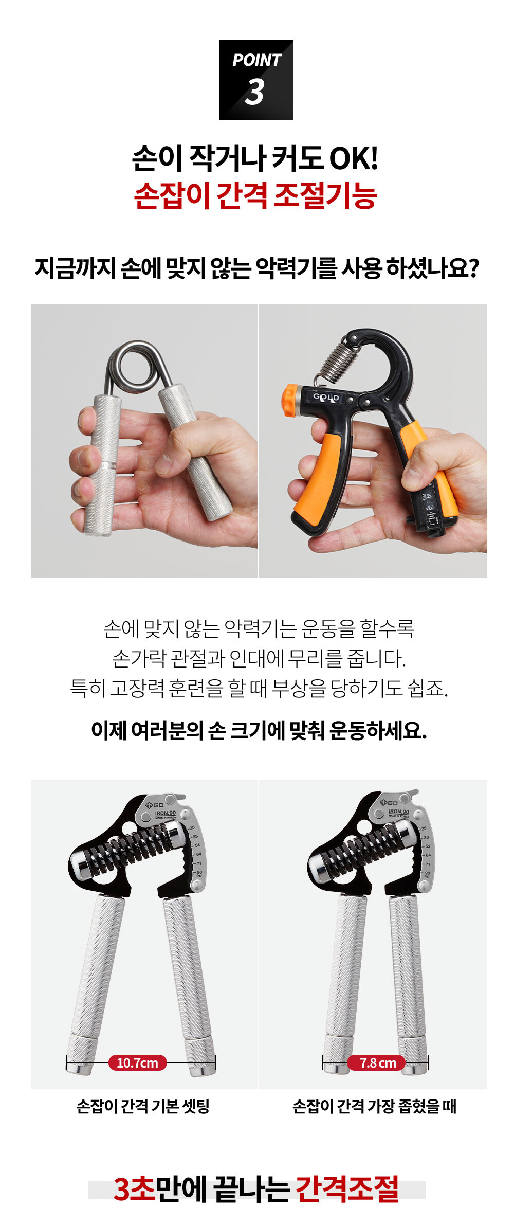 손잡이 하단부에 핀치그립을 장착하면 아이언 그립의 활용도가 훨씬 더 늘어나고, 강도를 변경하여 완력기 운동, 네일 밴딩 훈련등 매우 다양한 운동을 하실 수 있습니다.