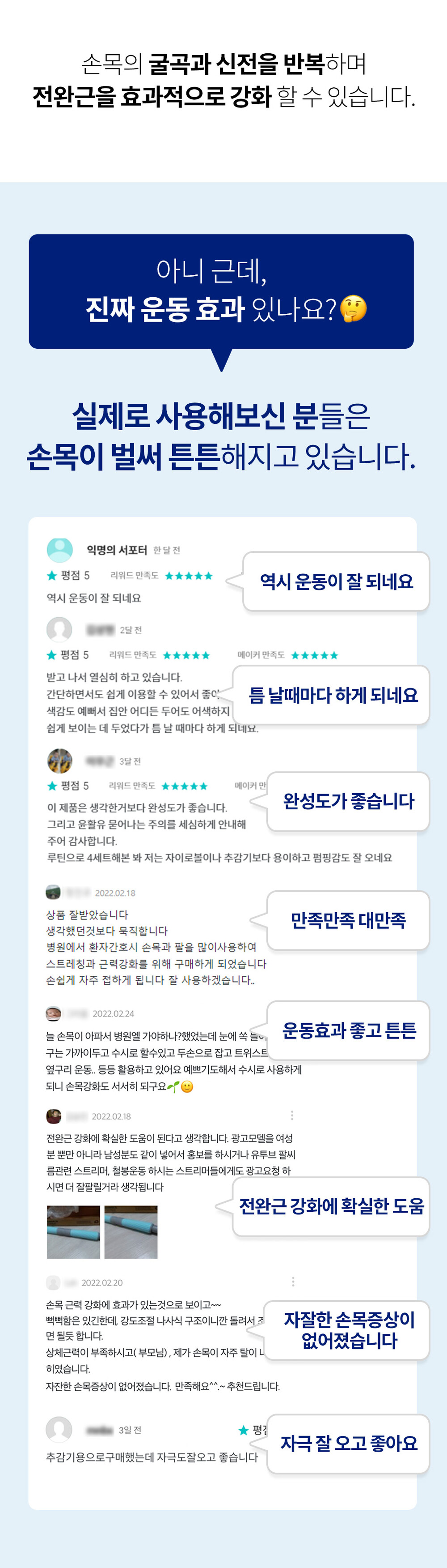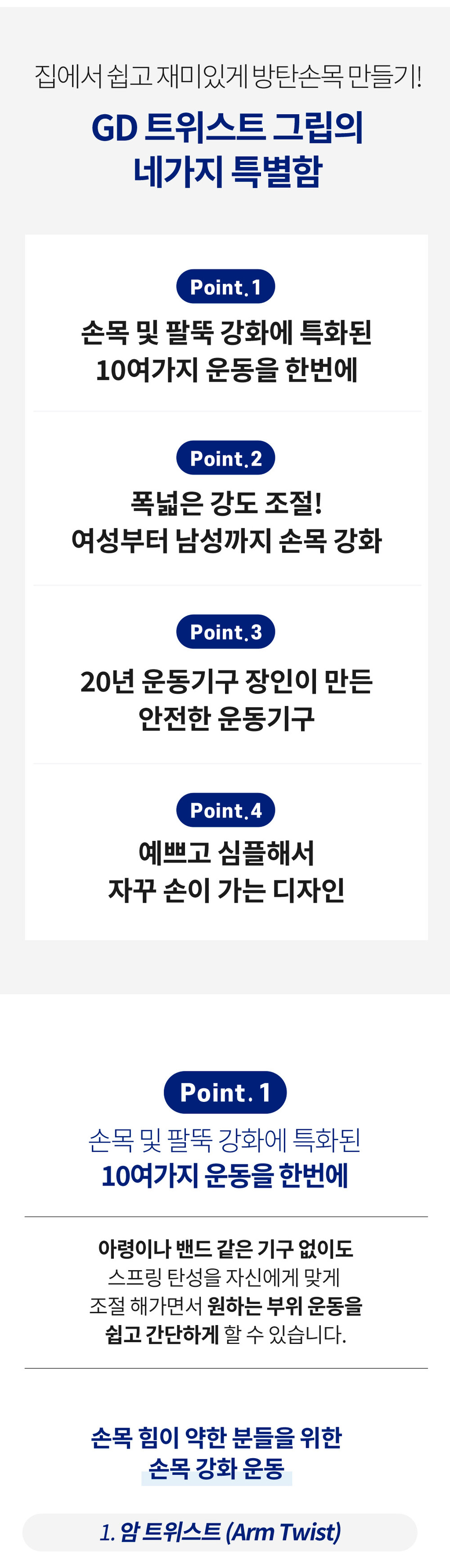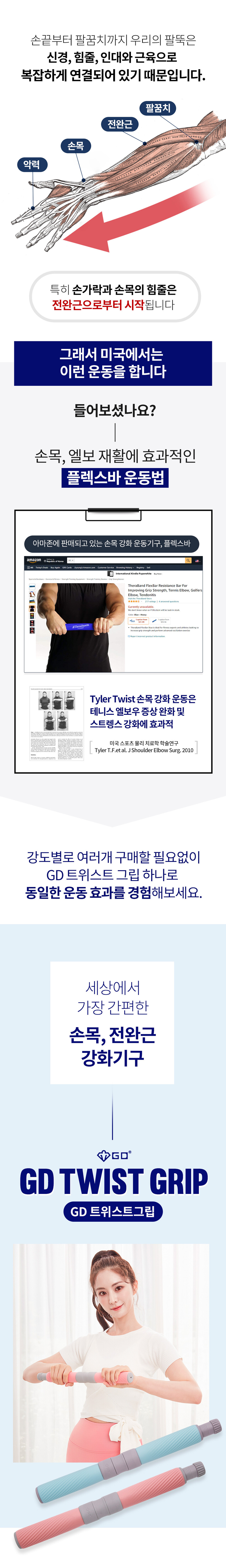 손목부터 전완근까지 GD트위스트 그립 하나로 끝. 손목 주변의 근력 강화는 물론 가동성도 넓혀주어 연약한 손목을 강철 손목으로 만들어줍니다. 스트레칭도 보호대도 개선해주지 못했던 손목과 엘보 이제 전문 기구로 관리하세요.